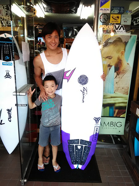 本当にお待たせしました!!調子が上がるマジックボード! H様 JUSTICE/田嶋シェイプ/HAWKEY THE RODFLEX 6’0″×20 1/2×2 5/8 より無敵テイクオフなのに〜ハイパフォーマンス! そんなだれもが羨む領域まで高めてくれるマジックボードですよ〜 乗れば乗る程、新マテリアルの性能でターンの伸びを感じて頂けますよ〜! それだけやない切れ味も抜群!!テンション上がって ニコニコになっちゃうボードです!! 最高の写真をお子様と一緒にありがとうございます!! 使ったら調子聞かせてくださいね〜!! とことん海を楽しむボード!残りわずか! サーフィンの調子が上がってるから!更に調子上がるボードが必要!