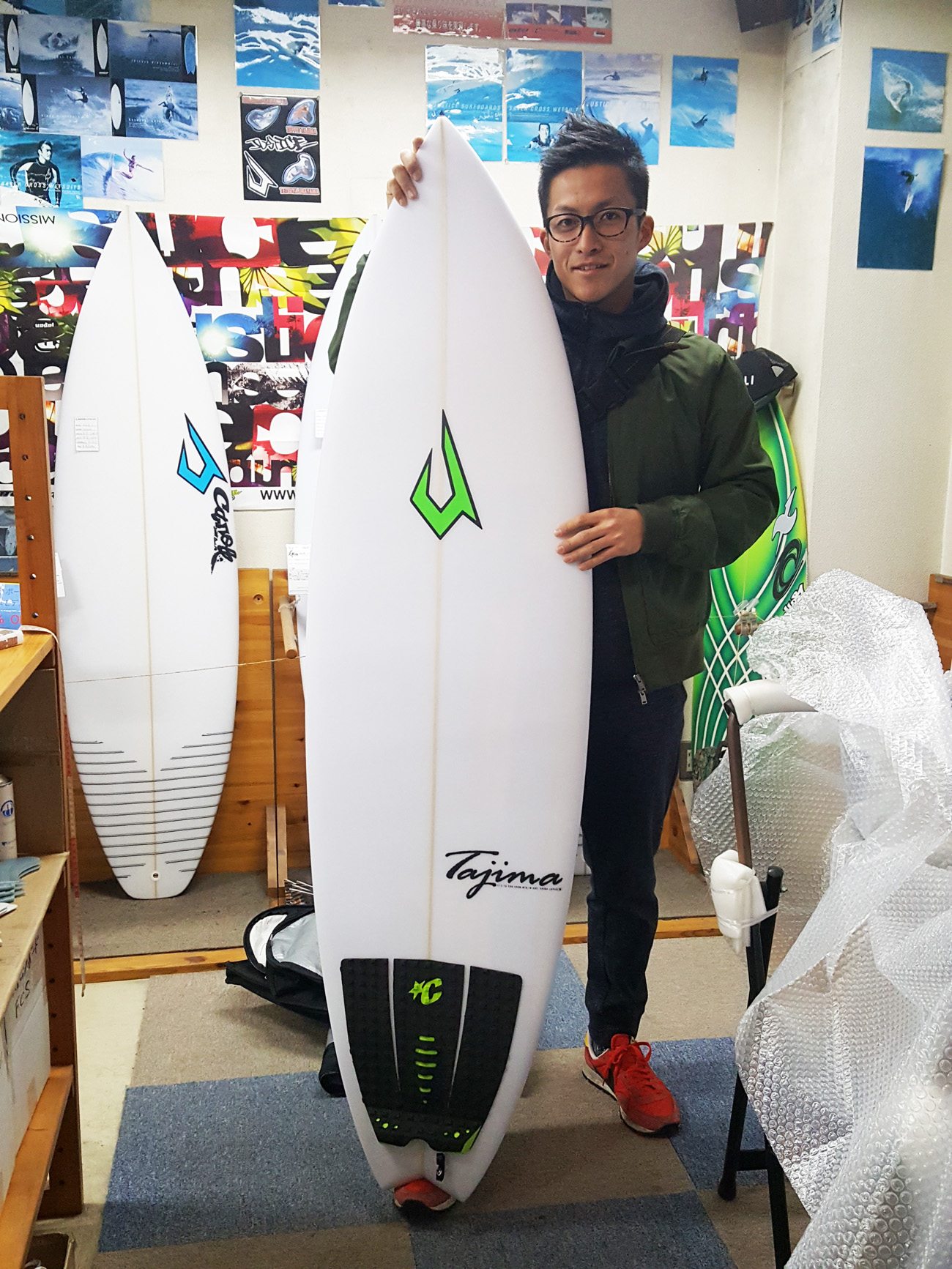 FOPPY 4チャンネル 中野君。 justice FOPPY 5’10 x 20 x 2 1/2 試乗ボードに乗って、スムーズで調子良くオーダーです。 自分サイズに微調整をして、 ボトムには4チャンネルを入れました。 ギュンギュン走るスピードマシン仕様です。 沢山波に乗って上達していこうね〜! justice FOPPY 3mm起毛は使い勝手抜群。 FOPPY来たよ〜!
