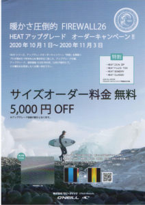 2020年10月6日東京店BLOGkillersurf13 ウェット セミドライのフェアーはまだまだあるよ〜O’NEILLとRIP CURLが代2弾のフェアーを実施中〜! オニールの次のフェアーは〜 HEATシリーズの FIREWALLアップグレードキャンペーンです! オーダー料無料プラス 通常¥10,000のアッ […]
