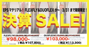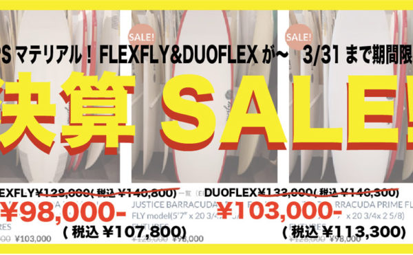 2021年3月14日湘南店BLOGkillersurf13 3/31まで限定価格!¥98,000〜FLEXFLY決算セール!3/31までの期間限定! 決算セール価格で〜 ストックDUOFLEXマテリアルの RAPTOR2モデルとBARRACUDA PRIMEモデルを〜 ¥103,000+TAX!! 各一本ずつなので サイズが合う方おすすめです […]