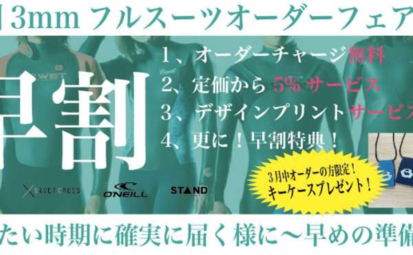 2021年3月7日新着情報killersurf13 今年は納期が不安定だから〜早めのフルスーツのご準備を〜(碇谷店長)早割3mmフルスーツオーダーで〜!! 確実に欲しい時にウエットが届くし〜 お得な価格&3月オーダーの方限定で〜 さらに! オリジナルキーケースをプレゼント!! そんなお得なフェアーで 早速沢山の方にオーダー頂いて […]
