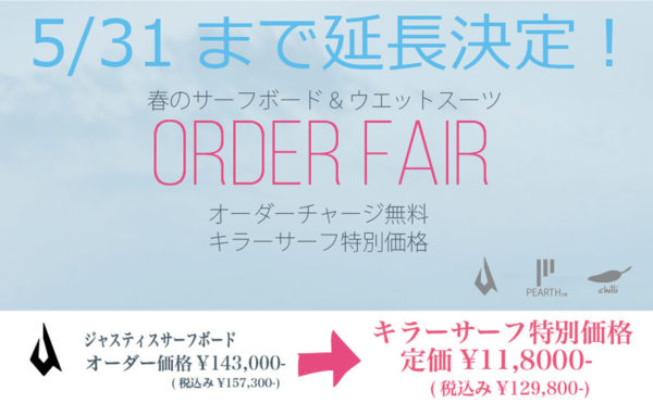 2022年5月10日新着情報killersurf13 春のサーフボード&ウエットスーツオーダーフェアー!5/31まで延長決定!春のサーフボード&ウエットスーツオーダーフェアーですが 大好評の為〜 5/31まで延長致します!! この様な世の中の状況で、いつ値上げになるが 分からない状況の中ですが 現行の価格のまま、 更に、キラーサーフ特別 […]