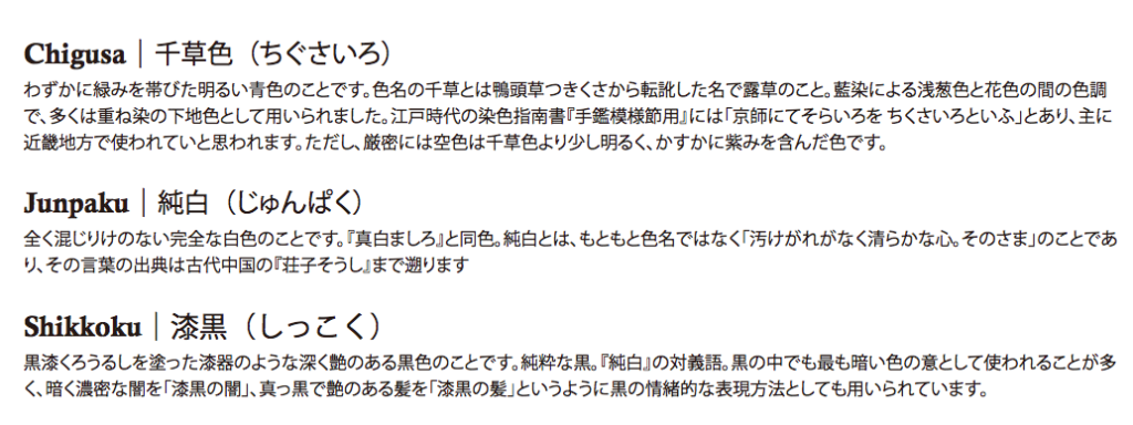 千草色、純白、漆黒、